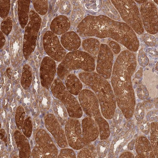 - Immunohistochemical staining of ERICH6B in human kidney tissue shows strong cytoplasmic positivity in renal tubules. Samples were probed using an ERICH6B Polyclonal Antibody (Product # PA5-59146).