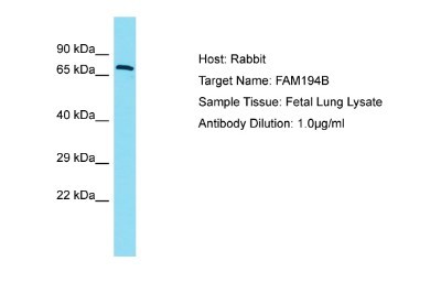 - Western Blot: FAM194B Antibody [NBP2-82646] - Host: Rabbit. Target Name: FAM194B. Sample Type: Fetal Lung lysates. Antibody Dilution: 1.0ug/ml