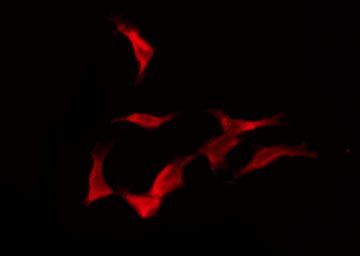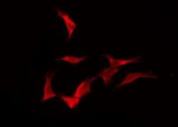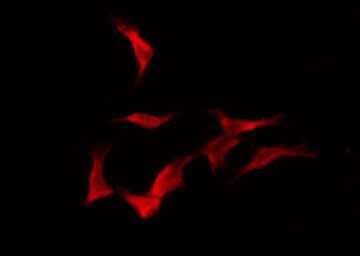- Immunofluorescent analysis of OR52E6 in HeLa cells. Samples were fixed with paraformaldehyde, permeabilized with 0.1% Triton X-100, blocked with 10% serum (45 min at 25°C) incubated with OR52E6 polyclonal antibody (Product # PA5-102137) using a dilution of 1:200 (1 hr, 37°C), and followed by goat anti-rabbit IgG Alexa Fluor 594 at a dilution of 1:600.