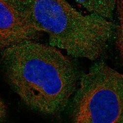 - Immunofluorecent analysis of Connexin 25 in human cell line U-2 OS using Connexin 25 Polyclonal Antibody (Product # PA5-140048). Staining shows localization to plasma membrane and cytosol.