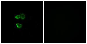 - Immunofluorescence analysis of MCF-7 cells, using OR56B4 antibody.The picture on the right is treated with the synthesized peptide.