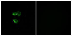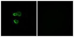 - Immunofluorescence analysis of MCF7 cells, using OR56B4 Antibody. The picture on the right is treated with the synthesized peptide.