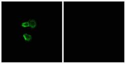 - Western blot analysis of lysates from COLO cells, using OR56B4 Antibody. The lane on the right is blocked with the synthesized peptide.