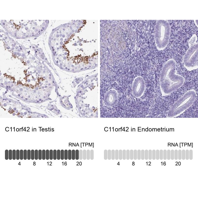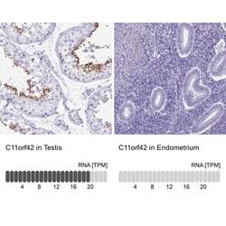 - Immunohistochemical staining of C11orf42 in human testis and endometrium tissues using C11orf42 Polyclonal Antibody (Product # PA5-64116). Corresponding C11orf42 RNA-seq data are presented for the same tissues.