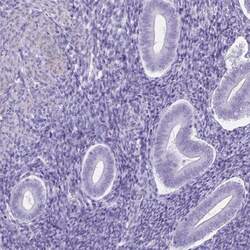 - Immunohistochemical staining of C11orf42 in human endometrium using C11orf42 Polyclonal Antibody (Product # PA5-64116) shows low expression as expected.