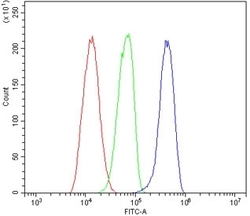 - Flow cytometry testing of human HL60 cells with USP25 antibody at 1ug/million cells (blocked with goat sera); Red=cells alone, Green=isotype control, Blue= USP25 antibody.