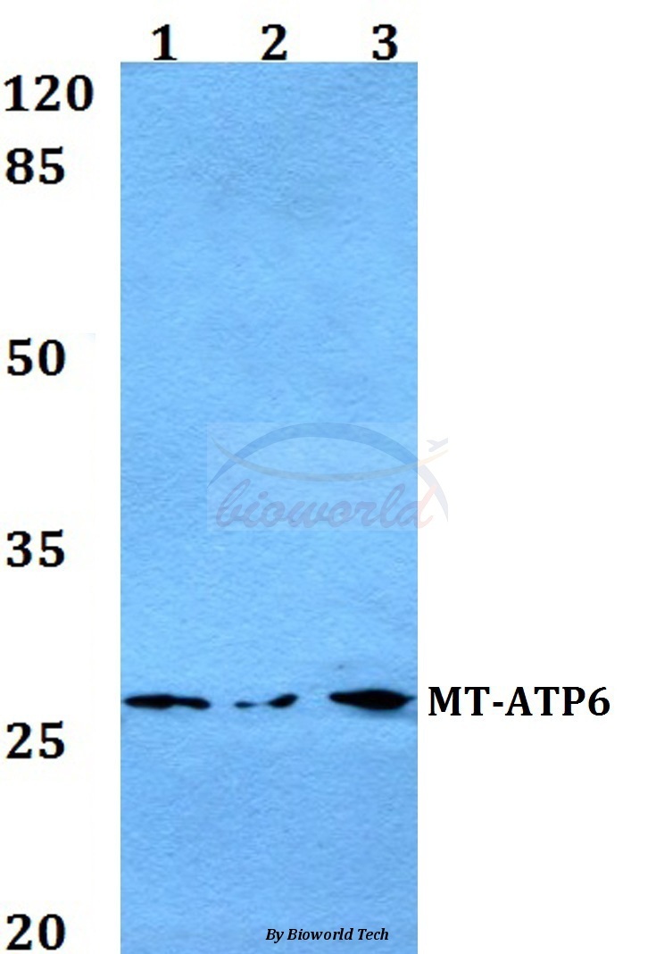 - Western blot (WB) analysis of MT-ATP6 pAb at 1:500 dilutionLane1:Hela whole cell lysateLane2:A549 whole cell lysateLane3:PC12 whole cell lysate
