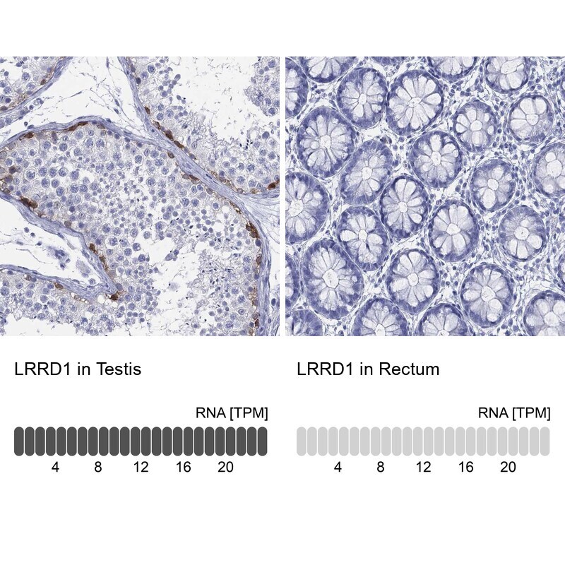 - Immunohistochemical analysis of LRRD1 in human testis and rectum tissues using LRRD1 Polyclonal Antibody (Product # PA5-140355) using Anti-LRRD1 antibody. Corresponding LRRD1 RNA-seq data are presented for the same tissues.