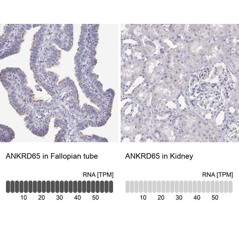 - Immunohistochemical staining of ANKRD65 in human fallopian tube and kidney tissues using ANKRD65 Polyclonal Antibody (Product # PA5-64240). Corresponding ANKRD65 RNA-seq data are presented for the same tissues.