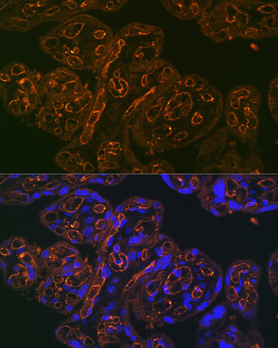 - Immunofluorescence analysis of human placenta using CD31/PECAM1 rabbit monoclonal antibody (STJ11102942) at dilution of 1:100 (40x lens). Blue: DAPI for nuclear staining.