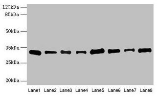 - Western blot. All lanes: PLP1 antibody at 4 ug/ml. Lane 1: HeLa whole cell lysate. Lane 2: HL60 whole cell lysate. Lane 3: K562 whole cell lysate. Lane 4: Thp-1 whole cell lysate. Lane 5: U937 whole cell lysate. Lane 6: A549 whole cell lysate. Lane 7: Caco-2 whole cell lysate. Lane 8: HepG-2 whole cell lysate. Secondary Goat polyclonal to Rabbit IgG at 1:10000 dilution. Predicted band size: 30 kDa. Observed band size: 30 kDa.