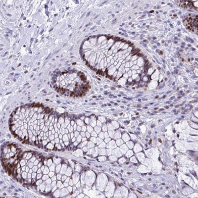 - Immunohistochemistry-Paraffin: C1qTNF10/C1qL2 Antibody [NBP2-34090] - Staining of human rectum shows strong nuclear positivity in glandular cells.