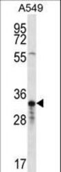 - OR4F5 Antibody western blot of A549 cell line lysates (35 ug/lane). The OR4F5 antibody detected the OR4F5 protein (arrow).
