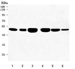 - Western blot testing of 1) human HeLa, 2) human SH-SY5Y, 3) rat brain, 4) mouse brain, 5) mouse testis and 6) mouse RAW246.7 cell lysate with Otoconin 90 antibody. Predicted molecular weight ~52 kDa.