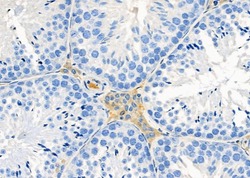 - Immunohistochemistry analysis of OR4N2 in mouse testis tissue. The sample was formaldehyde fixed and a heat mediated antigen retrieval step in citrate buffer was performed. Samples were incubated with OR4N2 polyclonal antibody (Product # PA5-99951) using a dilution of 1:100 (4°C overnight) followed by HRP conjugated anti-Rabbit secondary antibody.