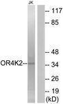 - Western blot analysis of extracts from Jurkat cells, using OR4K2 Antibody. The lane on the right is treated with the synthesized peptide.