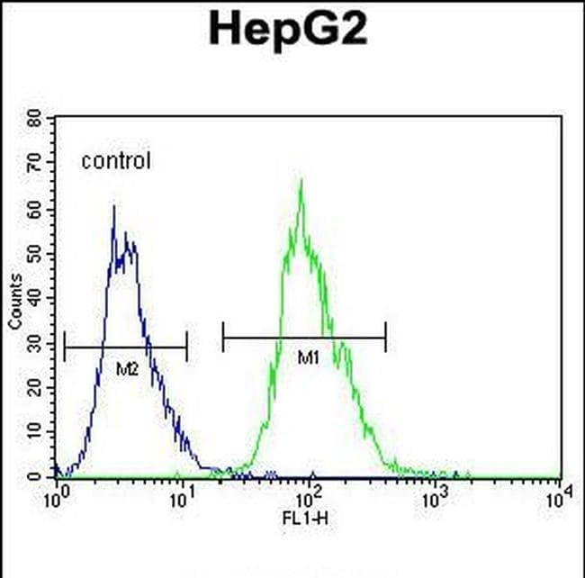 - Flow cytometric analysis of OR4K5 in HepG2 cells (right histogram) compared to a negative control cell (left histogram). Cells were probed with a OR4K5 Antibody (C-term) (Product # PA5-48320). Following incubation with the primary antibody, cells were incubated with FITC-conjugated goat-anti-rabbit secondary antibodies.