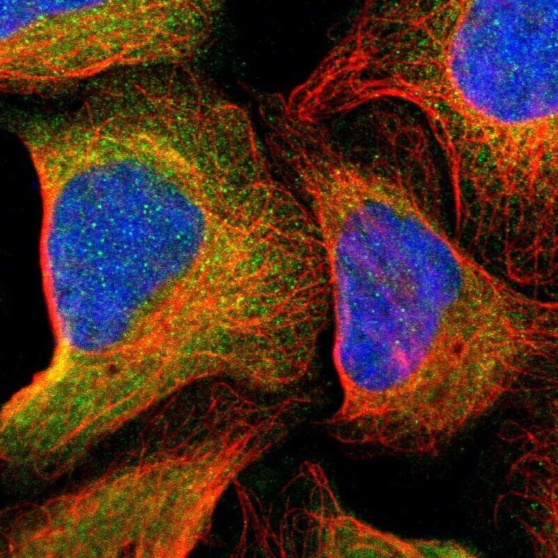 - Immunofluorescent staining of ASMTL in human cell line U-2 OS shows positivity in cytoplasm. Samples were probed using an ASMTL Polyclonal Antibody (Product # PA5-51979).