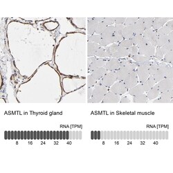 - Immunohistochemical staining of ASMTL in human thyroid gland and skeletal muscle tissues using ASMTL Polyclonal Antibody (Product # PA5-51979). Corresponding ASMTL RNA-seq data are presented for the same tissues.