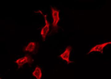 - Immunofluorescent analysis of OR5K3 in HeLa cells. Samples were fixed with paraformaldehyde, permeabilized with 0.1% Triton X-100, blocked with 10% serum (45 min at 25°C) incubated with OR5K3 polyclonal antibody (Product # PA5-104389) using a dilution of 1:200 (1 hr, 37°C), and followed by goat anti-rabbit IgG Alexa Fluor 594 at a dilution of 1:600.