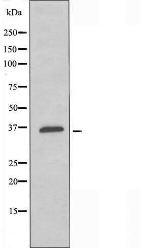 - Western blot analysis of OR5K3 in K562 cells. Samples were incubated with OR5K3 polyclonal antibody (Product # PA5-104389).