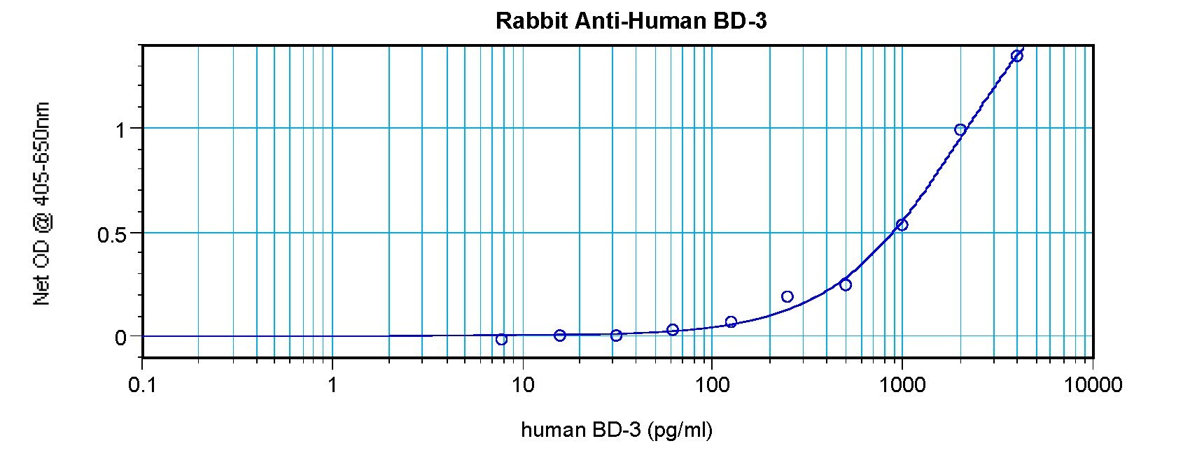 - AA Sequence of recombinant protein: GIINTLQKYY CRVRGGRCAV LSCLPKEEQI GKCSTRGRKC CRRKK. Preparation: Produced from sera of rabbits immunized with highly pure Recombinant Human BD-3. Anti-Human BD-3-specific antibody was purified by affinity chromatography employing an immobilized Human BD-3 matrix. Sandwich ELISA: To detect Human BD-3 by sandwich ELISA (using 100 µL/well antibody solution) a concentration of 0.5-2.0 µg/mL of this antibody is required. This antigen affinity purified antibody, in conjunction with PeproTech Biotinylated Anti-Human BD-3 (500-P241Bt) as a detection antibody, allows the detection of at least 0.2-0.4 ng/well of Recombinant Human BD-3. Western Blot: To detect Human BD-3 by Western Blot analysis this antibody can be used at a concentration of 0.1-0.2 µg/mL. Used in conjunction with compatible secondary reagents the detection limit for Recombinant Human BD-3 is 1.5-3.0 ng/lane, under either reducing or non-reducing conditions.