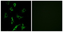 - Immunofluorescence analysis of COS-7 cells, using OR5B3 antibody. The picture on the right is treated with the synthesized peptide.