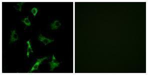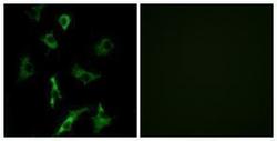 - Immunofluorescence analysis of COS7 cells, using OR5B3 Antibody. The picture on the right is treated with the synthesized peptide.