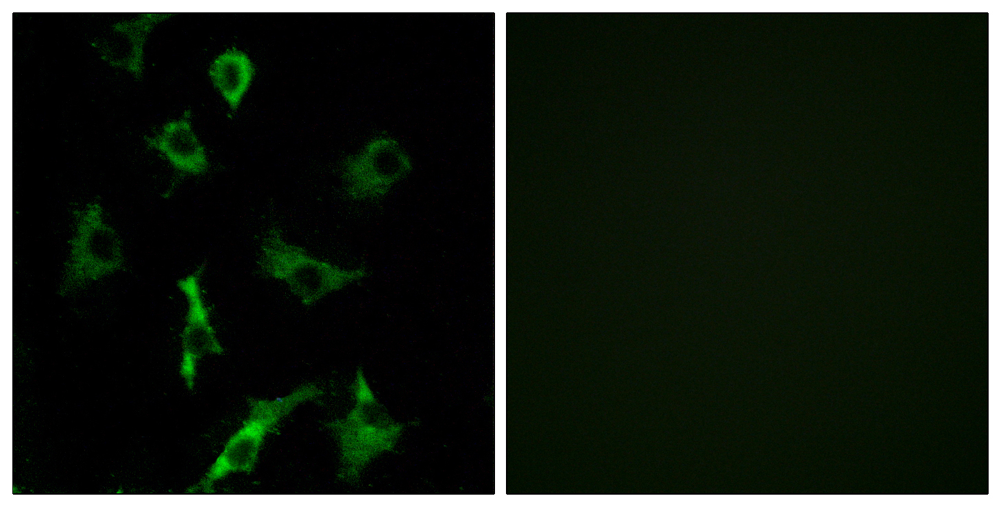 - Immunofluorescence analysis of COS7 cells, using OR5B3 Antibody. The picture on the right is blocked with the synthesized peptide.