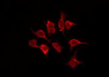 - Immunofluorescent analysis of OR5A2 in NIH-3T3. Samples were fixed with paraformaldehyde, permeabilized with 0.1% Triton X-100, blocked with 10% serum (45 min at 25°C) incubated with OR5A2 polyclonal antibody (Product # PA5-102204) using a dilution of 1:200 (1 hr, 37°C), and followed by goat anti-rabbit IgG Alexa Fluor 594 at a dilution of 1:600.