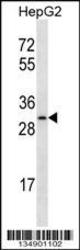 - OR4C12 Antibody (C-term) (Cat. #AP14726b) western blot analysis in HepG2 cell line lysates (35ug/lane).This demonstrates the OR4C12 antibody detected the OR4C12 protein (arrow).
