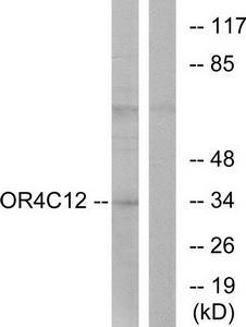 - Western blot analysis of extracts from Jurkat cells, using OR4C12 antibody.The lane on the right is treated with the synthesized peptide.