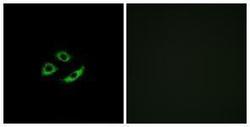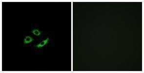 - Immunofluorescence analysis of A549 cells, using OR4C12 Antibody. The picture on the right is treated with the synthesized peptide.