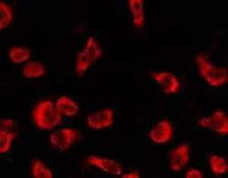 - Immunofluorescent analysis of OR4C12 in HeLa cells. Samples were fixed with paraformaldehyde, permeabilized with 0.1% Triton X-100, blocked with 10% serum (45 min at 25°C) incubated with OR4C12 polyclonal antibody (Product # PA5-103230) using a dilution of 1:200 (1 hr, 37°C), and followed by goat anti-rabbit IgG Alexa Fluor 594 at a dilution of 1:600.