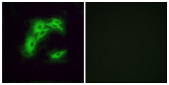 - Immunofluorescence analysis of A549 cells, using OR5I1 antibody. The picture on the right is treated with the synthesized peptide.