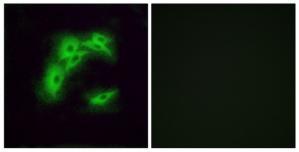 - Immunofluorescence analysis of A549 cells, using OR5I1 antibody.The picture on the right is treated with the synthesized peptide.