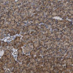 - Immunohistochemical staining of human pancreas shows cytoplasmic positivity in exocrine glandular cells.