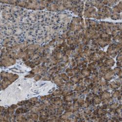 - Immunohistochemical staining of human pancreas shows cytoplasmic positivity in exocrine glandular cells.