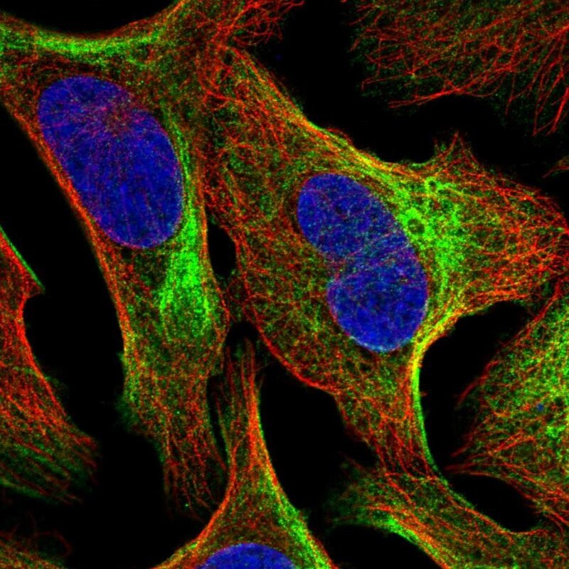 - Immunofluorescent staining of human cell line U-2 OS shows localization to actin filaments & intermediate filaments.