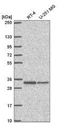 - Western Blot: TMEM81 Antibody [NBP2-57182] - Western blot analysis in human cell line RT-4 and human cell line U-251 MG.