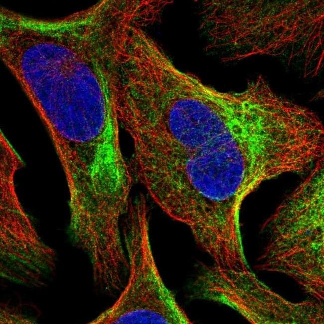 - Immunofluorescent staining of TMEM81 in human cell line U-2 OS shows localization to actin filaments and intermediate filaments. Samples were probed using a TMEM81 Polyclonal Antibody (Product # PA5-65728).