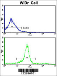 - Flow cytometric analysis of widr cells using KLC1 Antibody (Center)(bottom histogram) compared to a negative control cell (top histogram). FITC-conjugated goat-anti-rabbit secondary antibodies were used for the analysis.