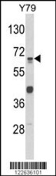 - Western blot analysis of KLC1 Antibody (Center) in Y79 cell lysates (35ug/lane). KLC1 (arrow) was detected using the purified Pab.