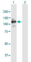 - Western Blot analysis of PCDHGA4 expression in transfected 293T cell line (H00056111-T01) by PCDHGA4 MaxPab polyclonal antibody.Lane 1: PCDHGA4 transfected lysate(102.41 KDa).Lane 2: Non-transfected lysate.
