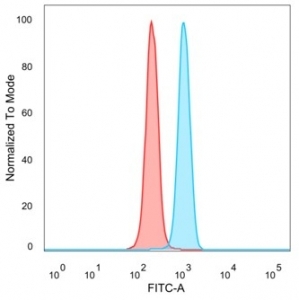 - Flow cytometry testing of PFA-fixed human HeLa cells with ZNF239 antibody (clone PCRP-ZNF239-2A10) followed by goat anti-mouse IgG-CF488 (blue), Red = unstained cells.