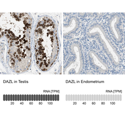 - Immunohistochemistry analysis in human testis and endometrium tissues using HPA019777 antibody. Corresponding DAZL RNA-seq data are presented for the same tissues.