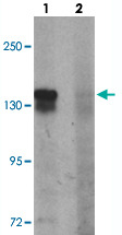 - Western blot analysis of CASKIN1 in HeLa cell lysate with CASKIN1 polyclonal antibody (Cat # PAB25642) at 1 ug/ml in (1) the absence and (2) the presence of blocking peptide.