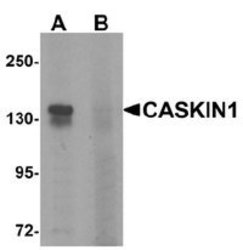 - Western blot analysis of CASKIN1 in HeLa cell lysate with CASKIN1 antibody Cat.-No AP55493PU-N at 1 ?g/ml in (A) the absence and (B) the presence of blocking peptide.
