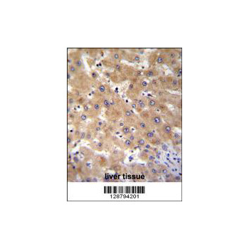 - GAGE12B Antibody (N-term) (Cat. #OAAB07499)immunohistochemistry analysis in formalin fixed and paraffin embedded human liver tissue followed by peroxidase conjugation of the secondary antibody and DAB staining.This data demonstrates the use of GAGE12B Antibody (N-term) for immunohistochemistry. Clinical relevance has not been evaluated.