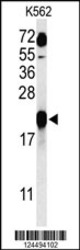 - Western blot analysis of GAGE7 Antibody (C-term) in K562 cell lysates (35ug/lane). GAGE7 (arrow) was detected using the purified Pab.